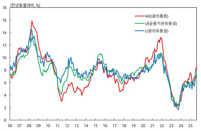 12일 한국은행(이하 한은)이 발표한 '2025년 9월 통화 및 유동성' 통계에 따르면 지난달 M2 평균잔액(이하 평잔)은 4430조5000억원으로 전월 대비 30조3000억원(0.7%) 증가한 것으로 집계됐다. 전년 동월 대비 증가율은 8.5%를 기록했다.