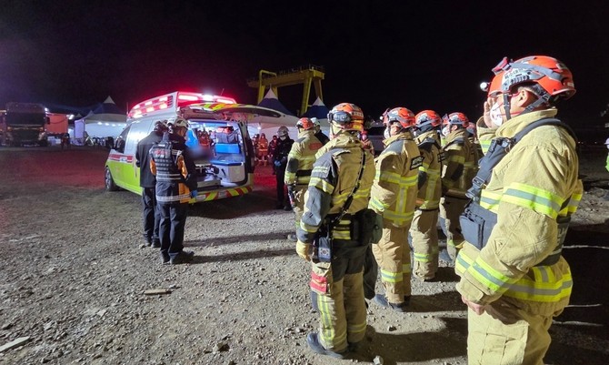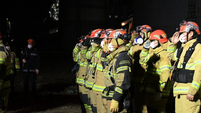 12일 오전, 구조대원과 소방대원들이 거수경례와 묵념 속 매몰자를 병원으로 이송하며 애도와 경의를 표해