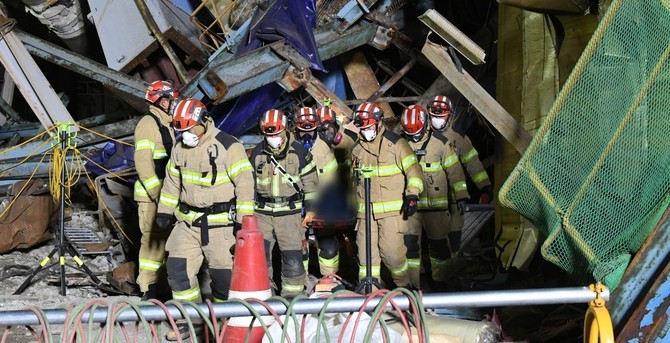 [포토] 소방청 "울산화력발전소 붕괴 참사, 구조대 매몰자 이송 현장"