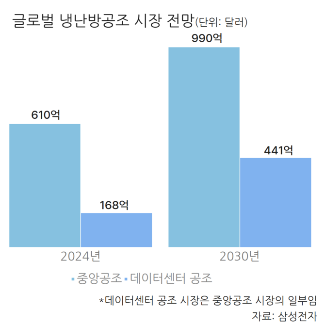 삼성전자에 따르면 글로벌 중앙공조 시장은 지난해 610억달러(약 85조9490억원)에서 2030년 990억달러(약 139조4910억원) 규모로 성장할 전망이다. 이 중 데이터센터 부문 공조 시장은 지난해 168억달러(23조원)에서 2030년 441억달러(61조원)로 성장이 더 가파를 것으로 예상된다.
