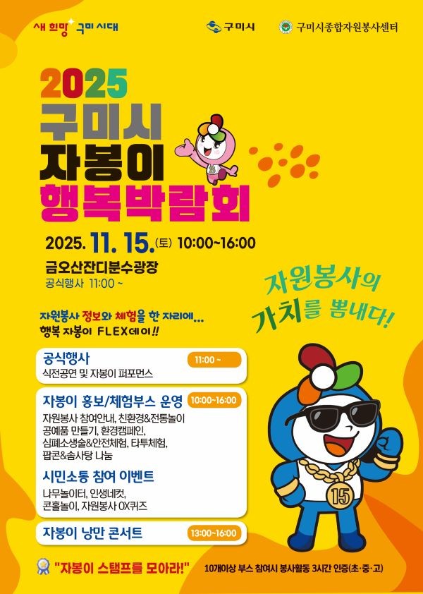 구미시는 오는 15일 오전 10시 금오산 잔디광장에서 '자원봉사의 가치를 뽐내다'를 주제로 2025 구미시 '자봉이 행복 박람회'를 연다.