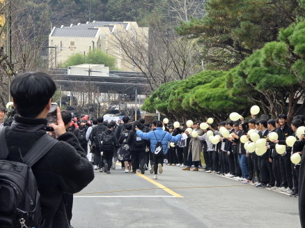 1·2학년 학생들과 교직원 등 400여 명은 교내 대동인의 상~학교 진입로 삼거리에서 하교하는 3학년 학생들을 맞아 박수갈채를 보내고 '수능 대박! 파이팅!'을 외치며 열렬한 응원을 보냈다.