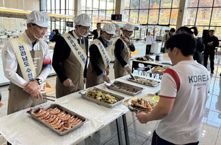행사장에서는 박영채 전남도 해양수산국장, 최현호 해양수산부 수산정책실장, 노동진 수협중앙회장, 김택수 선수촌장이 직접 수산물 특식 배식에 나서 선수단의 선전을 기원했다.