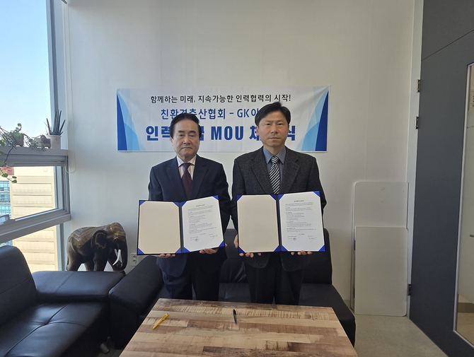 [프라임경제] 사단법인 친환경축산협회(회장 이덕선, 대표 안기홍)와 ㈜GK아너스(대표 권혁관)는 지속가능한 축산산업 발전과 인력자원 교류 활성화를 위해 '축산산업 인력 상생협력 업무협약(MOU)'을 체결했다.
