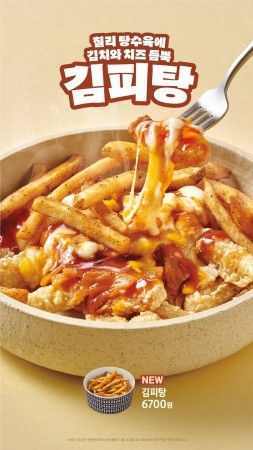 '김피탕'은 김치, 피자, 탕수육을 조합한 퓨전 요리다. 찹쌀탕수육 위에 볶음김치, 피자치즈, 케이준 후라이, 칠리소스 등을 더해 완성했다. 매콤한 김치와 부드러운 치즈, 바삭한 튀김이 어우러져 풍성한 맛을 낸다.