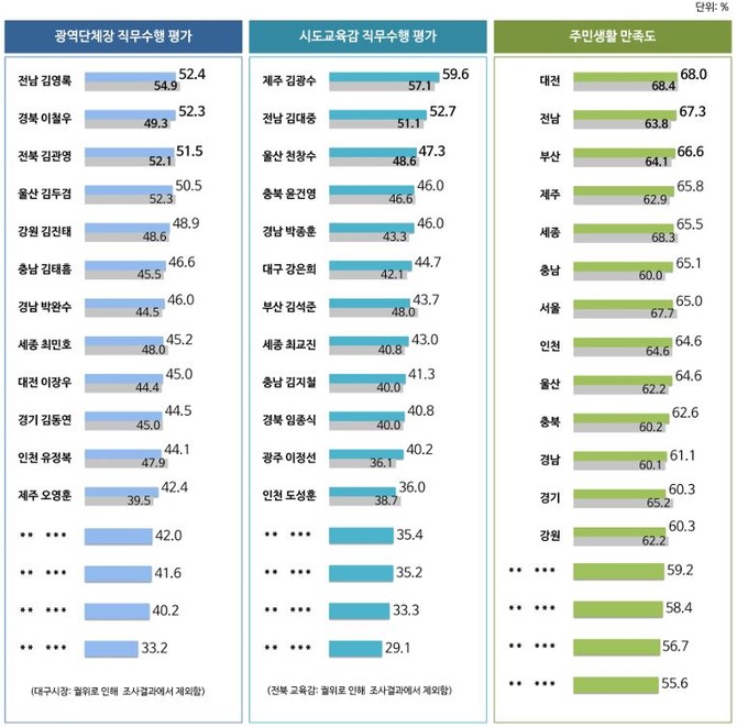 김광수 제주 교육감은 전월 대비 2.5%포인트 상승한 59.6%로 5개월 연속 1위를 차지하며 전국 교육감 중 유일하게 60%에 근접했다. 천창수 울산 교육감은 47.3%로 3위를 유지했다.