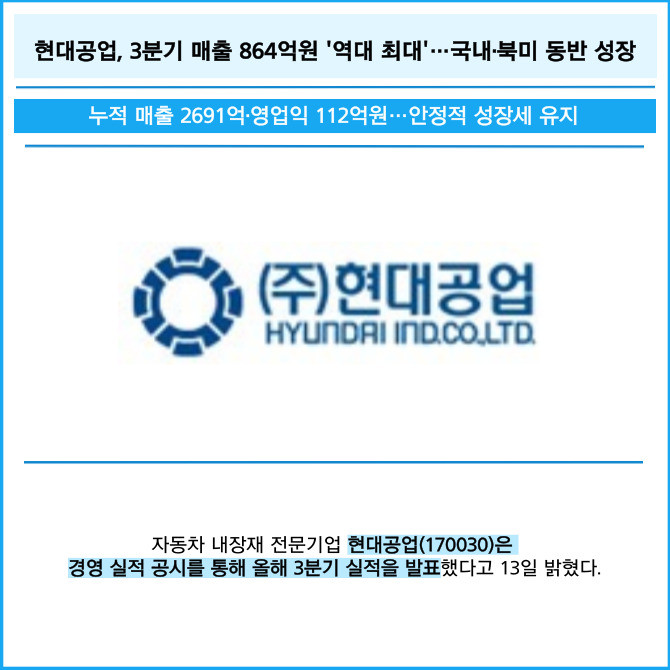 [프라임경제] 자동차 내장재 전문기업 현대공업(170030)은 경영 실적 공시를 통해 올해 3분기 실적을 발표했다고 13일 밝혔다.