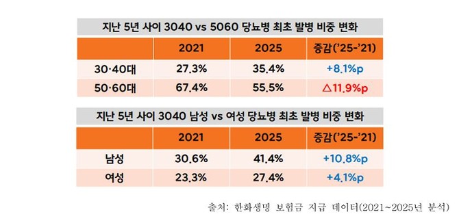 반면 2025년 5060세대는 55.5%로 감소하고, 3040세대는 반대로 35.4%로 증가했다. 이는 당뇨병이 더 이상 노년기 질환이 아니라 활동기 질환으로 바뀌고 있음을 보여준다.