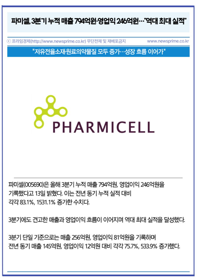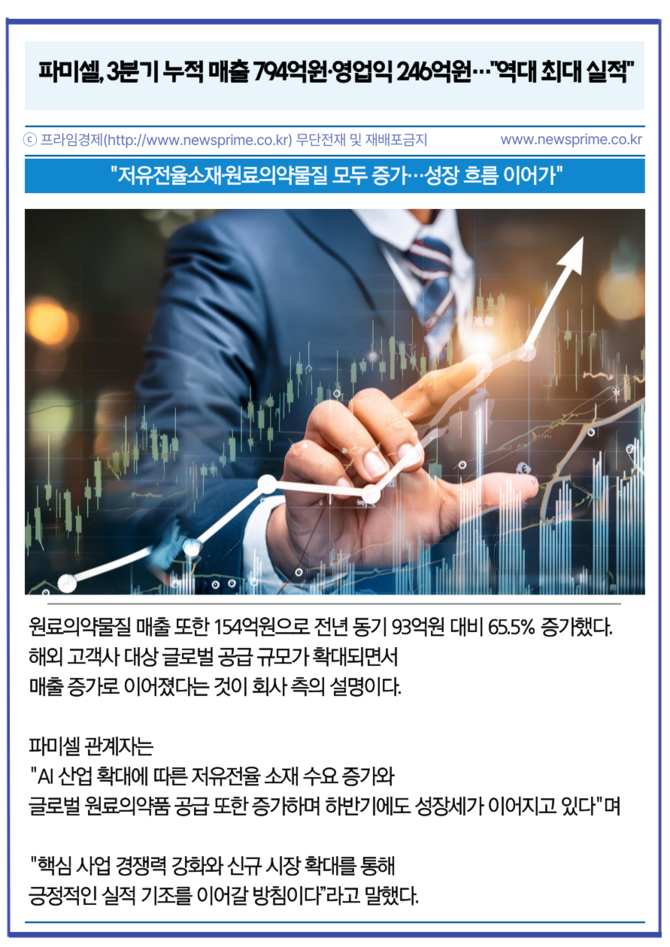 [카드] 파미셀, 3분기 누적 매출 794억원·영업익 246억원…"역대 최대 실적"