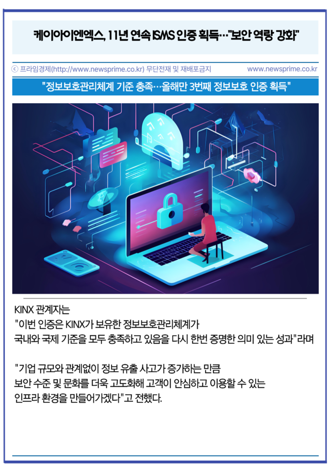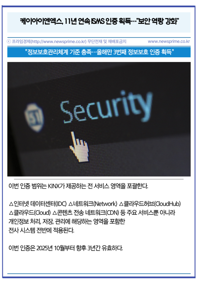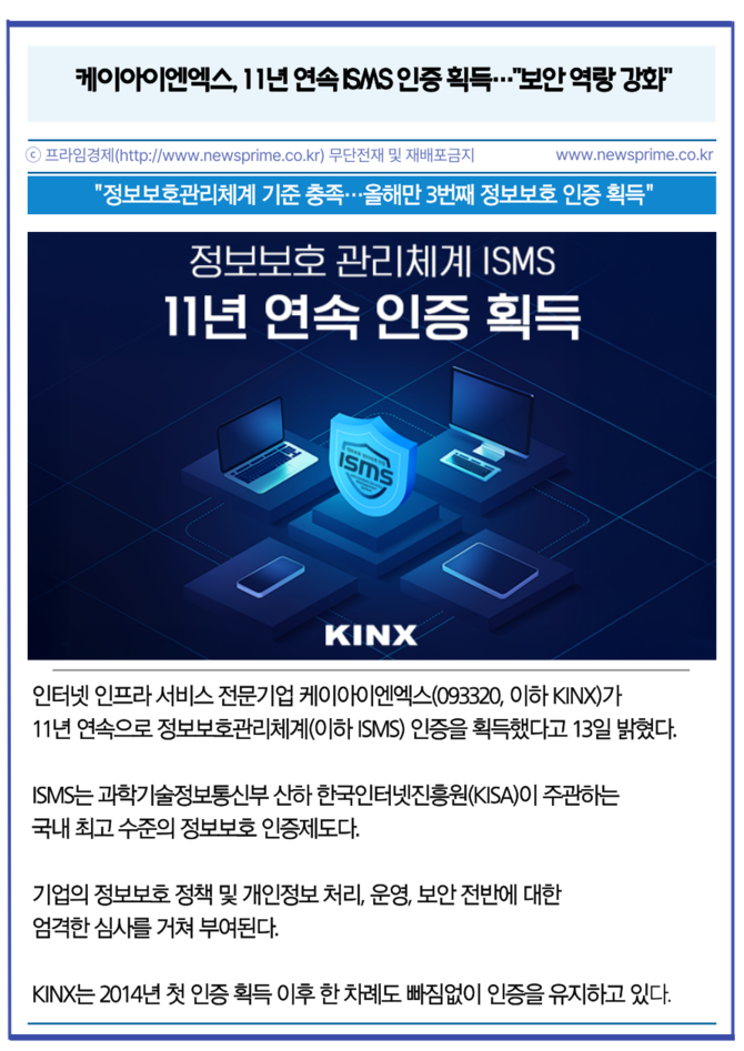 [프라임경제] 인터넷 인프라 서비스 전문기업 케이아이엔엑스(093320, 이하 KINX)가 11년 연속으로 정보보호관리체계(이하 ISMS) 인증을 획득했다고 13일 밝혔다.