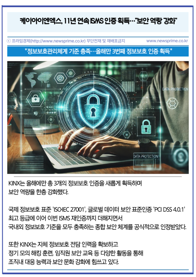 ISMS는 과학기술정보통신부 산하 한국인터넷진흥원(KISA)이 주관하는 국내 최고 수준의 정보보호 인증제도다. 기업의 정보보호 정책 및 개인정보 처리, 운영, 보안 전반에 대한 엄격한 심사를 거쳐 부여된다. KINX는 2014년 첫 인증 획득 이후 한 차례도 빠짐없이 인증을 유지하고 있다.