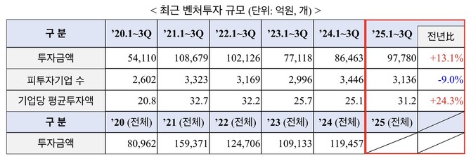13일 중소벤처기업부(장관 한성숙, 이하 중기부)가 발표한 '2025년 3분기 신규 벤처투자 및 벤처펀드 결성 동향'에 따르면, 올해 1~3분기 신규 벤처투자는 전년 동기 대비 13.1% 증가했다.