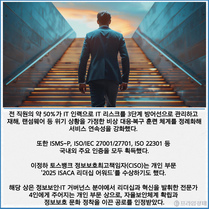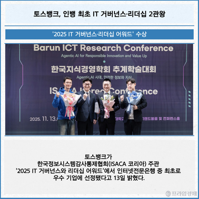 [프라임경제] 토스뱅크가 한국정보시스템감사통제협회(ISACA 코리아) 주관 '2025 IT 거버넌스와 리더십 어워드'에서 인터넷전문은행 중 최초로 우수 기업에 선정됐다고 13일 밝혔다.