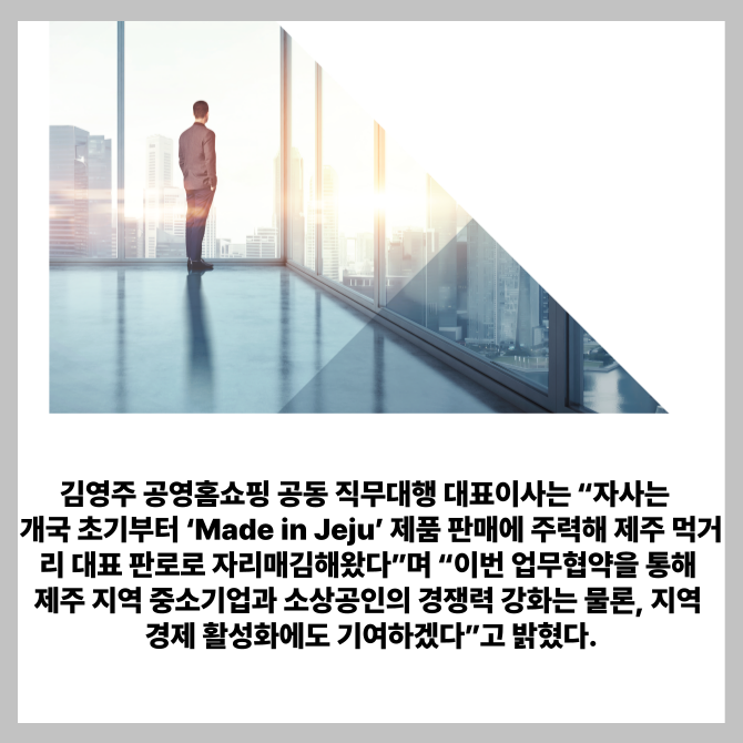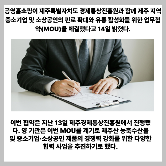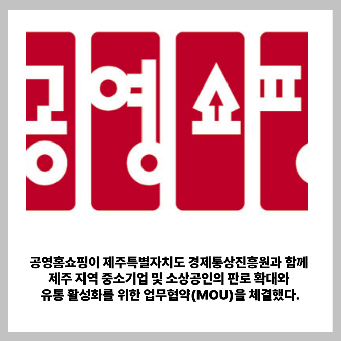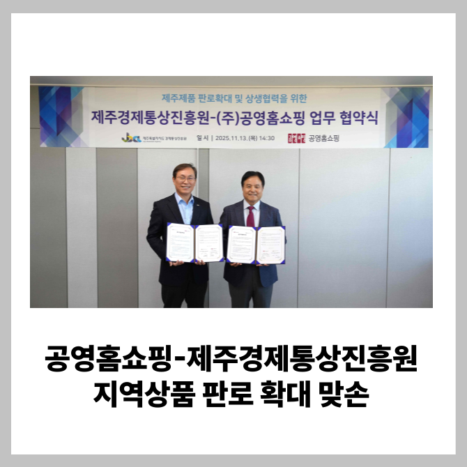 [프라임경제] 공영홈쇼핑이 제주특별자치도 경제통상진흥원과 함께 제주 지역 중소기업 및 소상공인의 판로 확대와 유통 활성화를 위한 업무협약(MOU)을 체결했다고 14일 밝혔다.