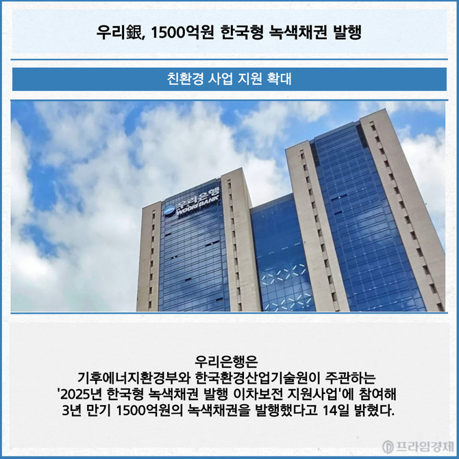 [프라임경제] 우리은행은 기후에너지환경부와 한국환경산업기술원이 주관하는 '2025년 한국형 녹색채권 발행 이차보전 지원사업'에 참여해 3년 만기 1500억원의 녹색채권을 발행했다고 14일 밝혔다.