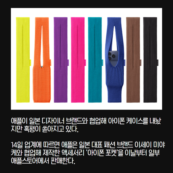 14일 업계에 따르면 애플은 일본 대표 패션 브랜드 이세이 미야케와 협업해 제작한 액세서리 '아이폰 포켓'을 이날부터 일부 애플스토어에서 판매한다.