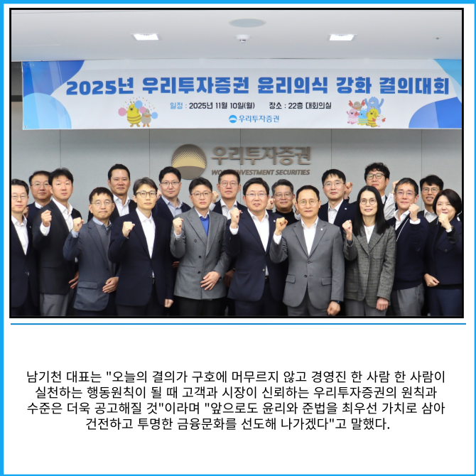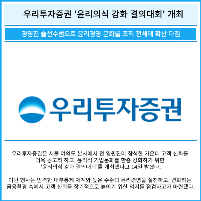 [프라임경제] 우리투자증권은 서울 여의도 본사에서 전 임원진이 참석한 가운데 고객 신뢰를 더욱 공고히 하고, 윤리적 기업문화를 한층 강화하기 위한 '윤리의식 강화 결의대회'를 개최했다고 14일 밝혔다.