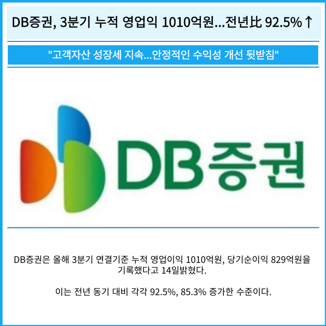 [카드] DB증권, 3분기 누적 영업익 1010억원...전년比 92.5%↑