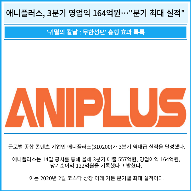 [카드] 애니플러스, 3분기 영업익 164억원…"분기 최대 실적"