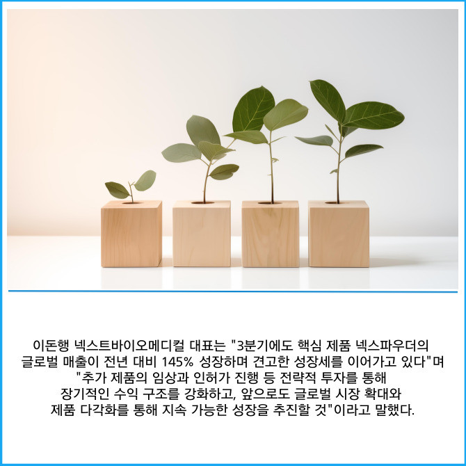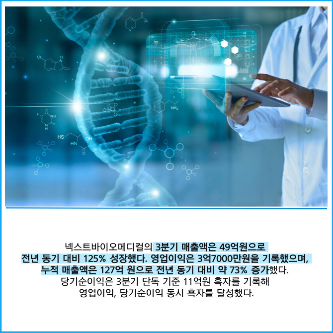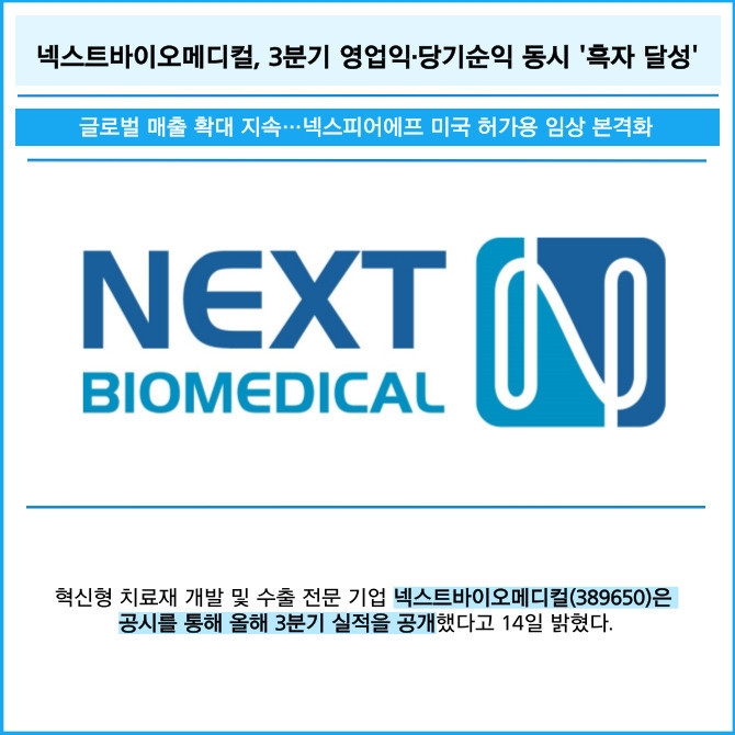 [프라임경제] 혁신형 치료재 개발 및 수출 전문 기업 넥스트바이오메디컬(389650)은 공시를 통해 올해 3분기 실적을 공개했다고 14일 밝혔다.