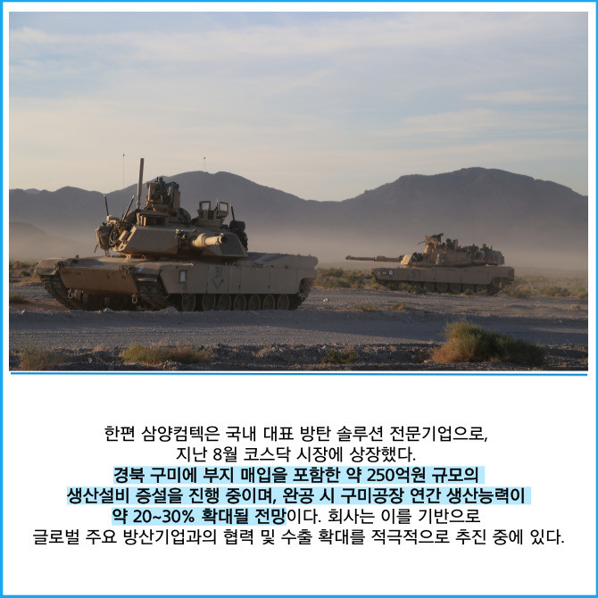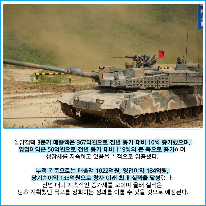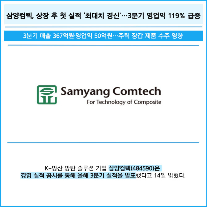 [프라임경제] K-방산 방탄 솔루션 기업 삼양컴텍(484590)은 경영 실적 공시를 통해 올해 3분기 실적을 발표했다고 14일 밝혔다.