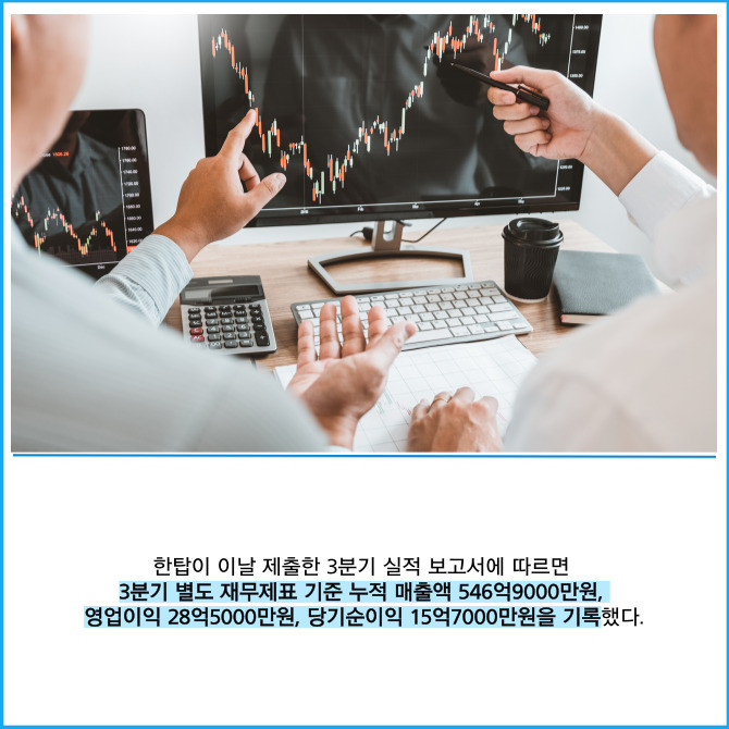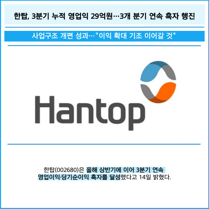 [카드] 한탑, 3분기 누적 영업익 29억원…3개 분기 연속 흑자 행진