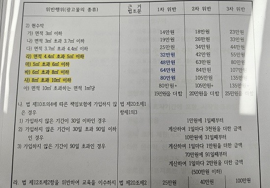 불법으로 게첩된 현수막에 대한 과태료는 건당 14만원에서 80만원으로 부과되도록 관련 법에 규정되어 있고, 특히 반복적인 불법현수막에 대해서는 최대 500만원까지 부과할 수 있도록 정해져 있다.
