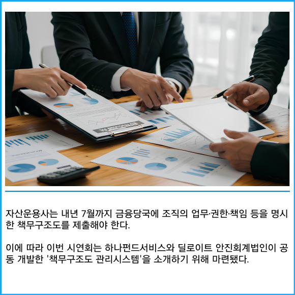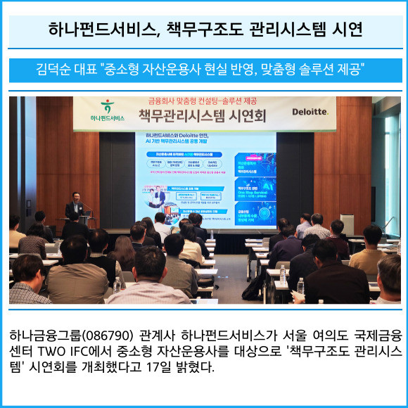 [프라임경제] 하나금융그룹(086790) 관계사 하나펀드서비스가 서울 여의도 국제금융센터 TWO IFC에서 중소형 자산운용사를 대상으로 '책무구조도 관리시스템' 시연회를 개최했다고 17일 밝혔다.
