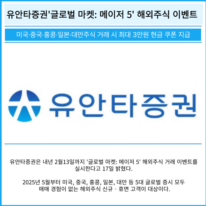 2025년 5월부터 미국, 중국, 홍콩, 일본, 대만 등 5대 글로벌 증시 모두 매매 경험이 없는 해외주식 신규‧휴면 고객이 대상이다.