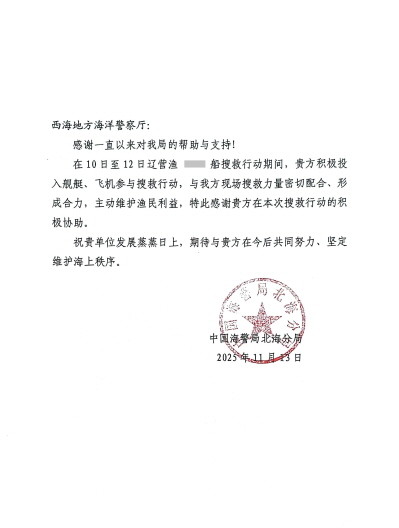 중국해경은 서한문을 통해 한국 해경이 자국(중국 해경)과 긴밀히 협력하고 함께 힘을 모아 효율적인 수색 구조를 진행한 데 대해 특별한 감사를 보내며, 앞으로 양 기관이 해양질서 수호를 위해 함께 노력해 나가길 기대한다고 전했다.