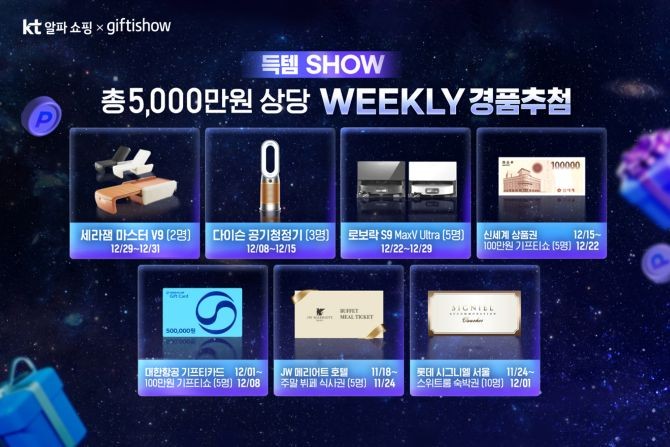 12월 마지막주까지 매주 위클리 경품 이벤트를 열고, 응모 및 추첨을 통해 총 5천만원 상당의 푸짐한 경품을 증정한다. 주차별 상품은 △JW 메리어트 호텔 주말 4인 뷔페 식사권 (5인) △롯데 시그니엘 서울 스위트룸 숙박권(10인) △대한항공 기프트카드 100만원권(5인) △다이슨 핫앤쿨 공기청정기 HP2(3인) △신세계 상품권 100만원권(5인) △로보락 로봇청소기 S9맥스(5인) △세라잼 마스터V9 안마기(2인) 이다. 구매 이력이 없어도 신규 및 통합회원 누구나 응모할 수 있다.