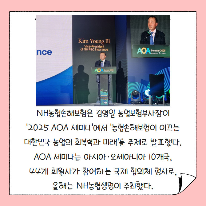[프라임경제] NH농협손해보험은 김영일 농업보험부사장이 '2025 AOA 세미나'에서 '농협손해보험이 이끄는 대한민국 농업의 회복력과 미래'를 주제로 발표했다고 18일 밝혔다. AOA 세미나는 아시아·오세아니아 10개국, 44개 회원사가 참여하는 국제 협의체 행사로, 올해는 NH농협생명이 주최했다.