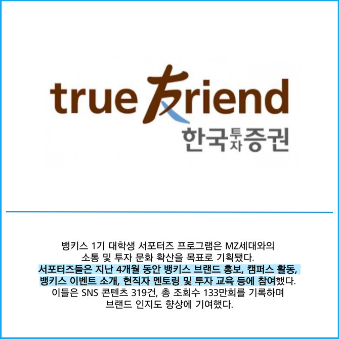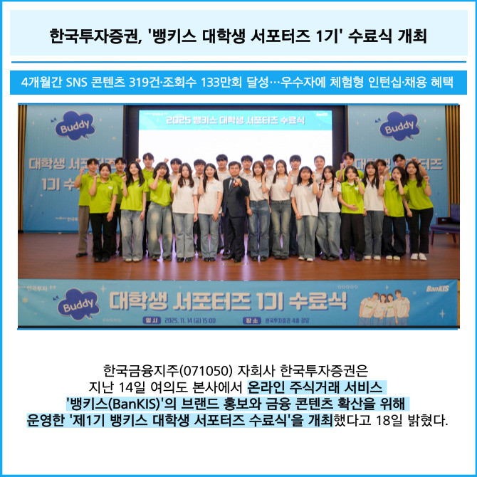 [프라임경제] 한국금융지주(071050) 자회사 한국투자증권은 지난 14일 여의도 본사에서 온라인 주식거래 서비스 뱅키스(BanKIS)의 브랜드 홍보와 금융 콘텐츠 확산을 위해 운영한 '제1기 뱅키스 대학생 서포터즈 수료식'을 개최했다고 18일 밝혔다.