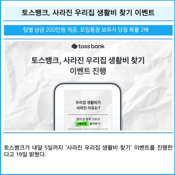 [프라임경제] 토스뱅크가 내달 5일까지 '사라진 우리집 생활비 찾기' 이벤트를 진행한다고 19일 밝혔다.