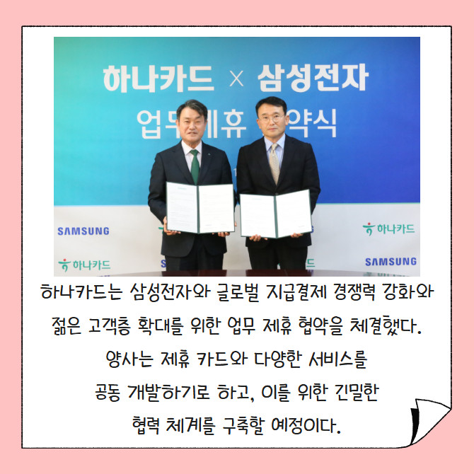 [프라임경제] 하나카드는 삼성전자와 글로벌 지급결제 경쟁력 강화와 젊은 고객층 확대를 위한 업무 제휴 협약을 체결했다. 양사는 제휴 카드와 다양한 서비스를 공동 개발하기로 하고, 이를 위한 긴밀한 협력 체계를 구축할 예정이다.