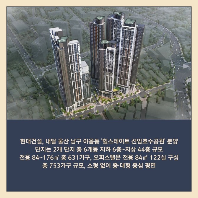 [프라임경제] 현대건설(000720)이 울산 남구 야음동에 중·대형 중심 신규 단지 '힐스테이트 선암호수공원'을 선보이며 본격 분양에 돌입한다. 총 753가구 규모로 조성되는 이번 단지는 전용 84㎡ 위주로 구성돼 실수요자의 관심이 모이고 있다.