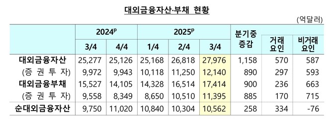 한국은행(이하 한은)이 19일 발표한 '2025년 3분기 국제투자대조표(잠정)'에 따르면 3분기 말 기준 우리나라 대외금융자산은 2조7976억달러로 집계됐다. 지난 2분기 말(2조6818억달러)보다 1158억달러 증가, 역대 최대 규모를 경신했다. 해외 증권투자가 증가하면서다.