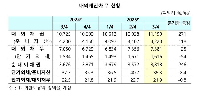 대외채무는 7381억달러로 25억달러 증가하는 데 그쳤다. 채무상품직접투자 중심으로 장기외채가 증가, 차익거래유인 축소로 단기 부채성증권·차입금이 줄어들면서 단기외채 감소로 증가폭을 제한한 영향이다.