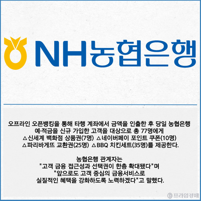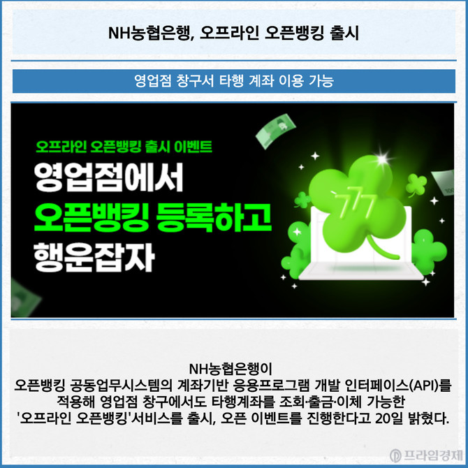 [프라임경제] NH농협은행이 오픈뱅킹 공동업무시스템의 계좌기반 응용프로그램 개발 인터페이스(API)를 적용해 영업점 창구에서도 타행계좌를 조회·출금·이체 가능한 '오프라인 오픈뱅킹'서비스를 출시, 오픈 이벤트를 진행한다고 20일 밝혔다.