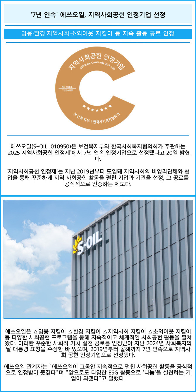 [프라임경제] 에쓰오일(S-OIL, 010950)은 보건복지부와 한국사회복지협의회가 주관하는 '2025 지역사회공헌 인정제'에서 7년 연속 인정기업으로 선정됐다고 20일 밝혔다.