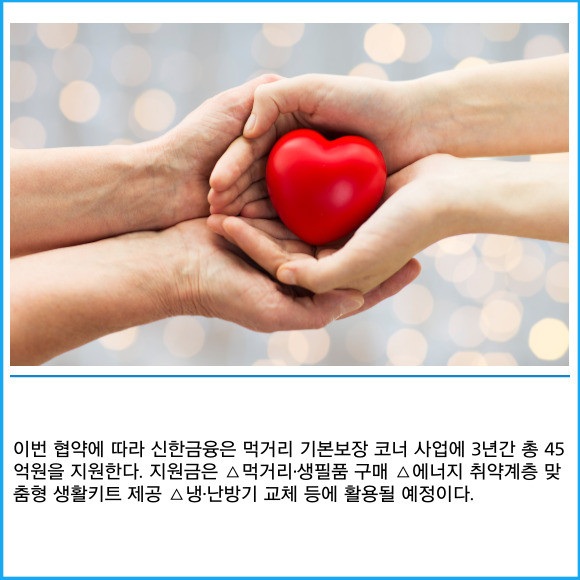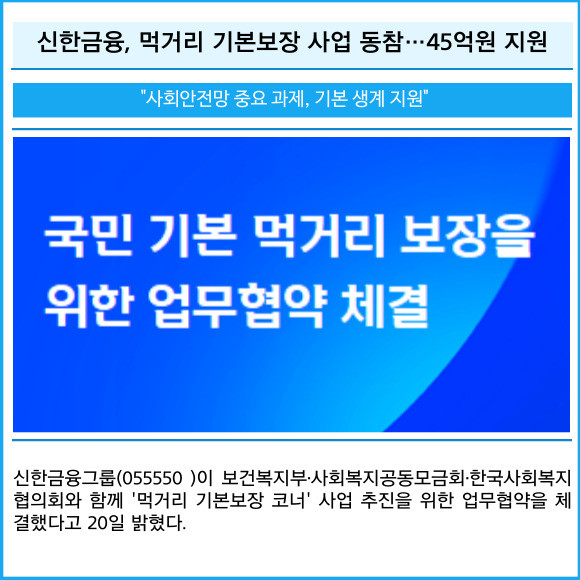 [프라임경제] 신한금융그룹(055550 )이 보건복지부·사회복지공동모금회·한국사회복지협의회와 함께 '먹거리 기본보장 코너' 사업 추진을 위한 업무협약을 체결했다고 20일 밝혔다.