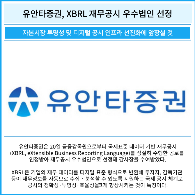 [프라임경제] 유안타증권(003470)은 20일 금융감독원으로부터 국제표준 데이터 기반 재무공시(XBRL, eXtensible Business Reporting Language)를 성실히 수행한 공로를 인정받아 재무공시 우수법인으로 선정돼 감사장을 수여받았다.