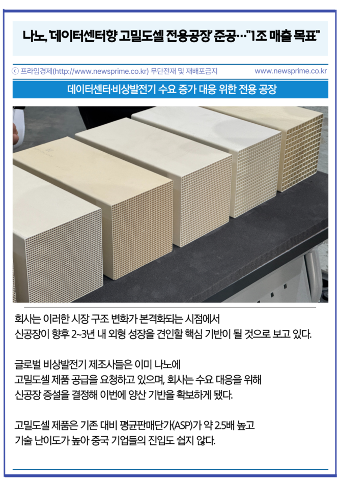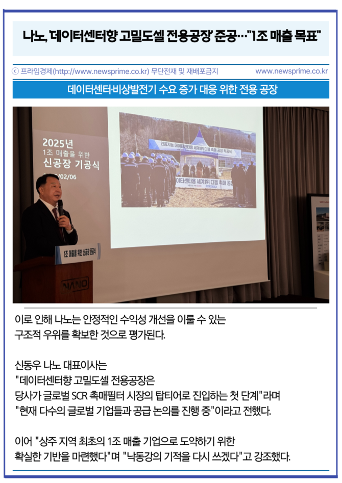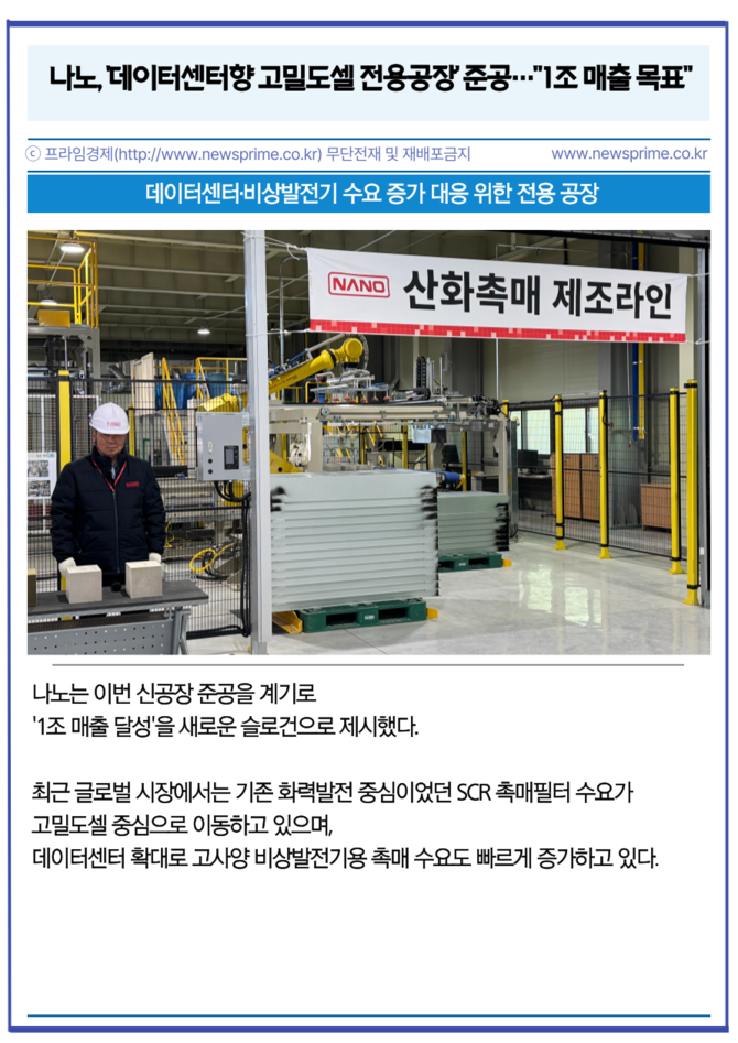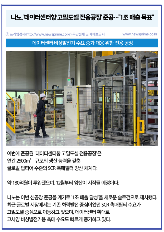 [프라임경제] 선택적 촉매 환원(SCR) 탈질촉매 필터 전문기업 나노(187790)가 21일 '데이터센터향 고밀도셀 전용공장 준공식'을 개최했다고 밝혔다.
