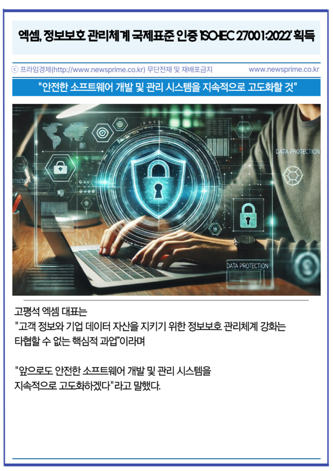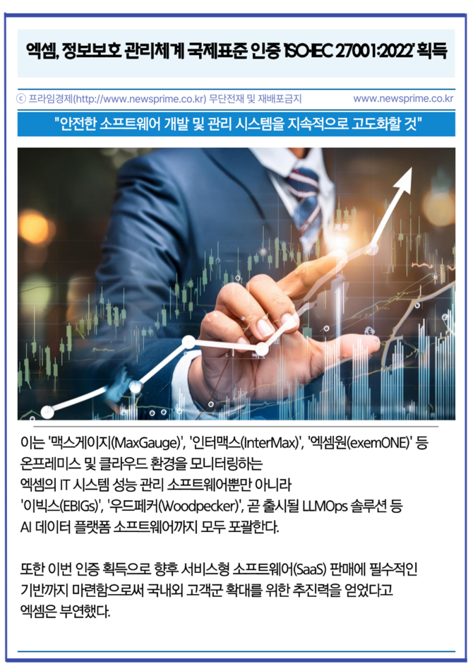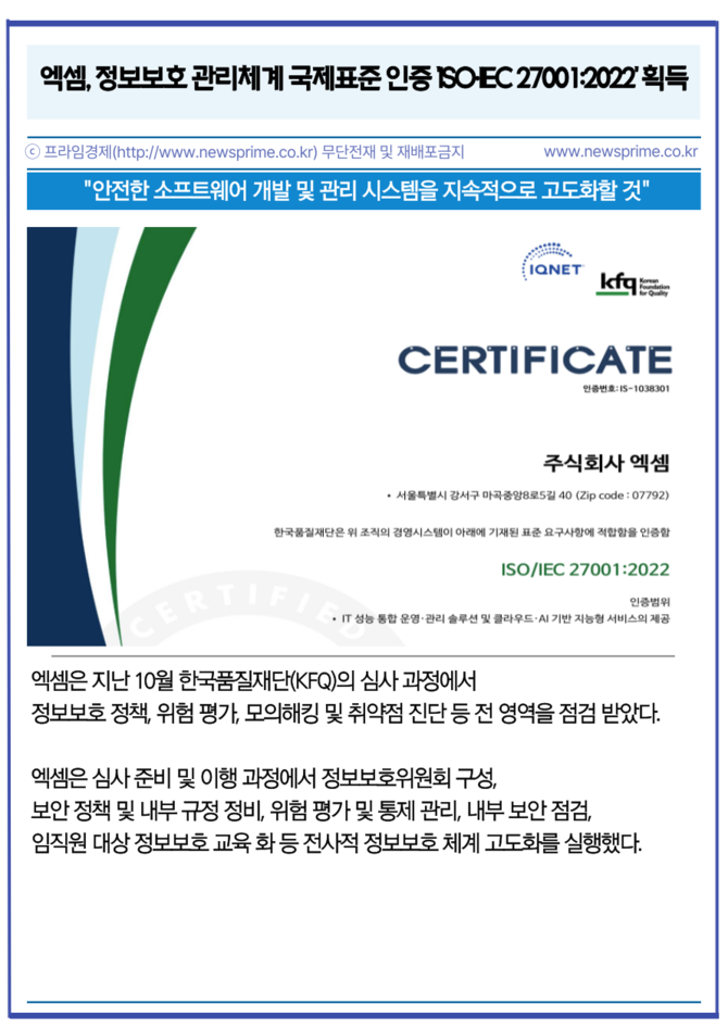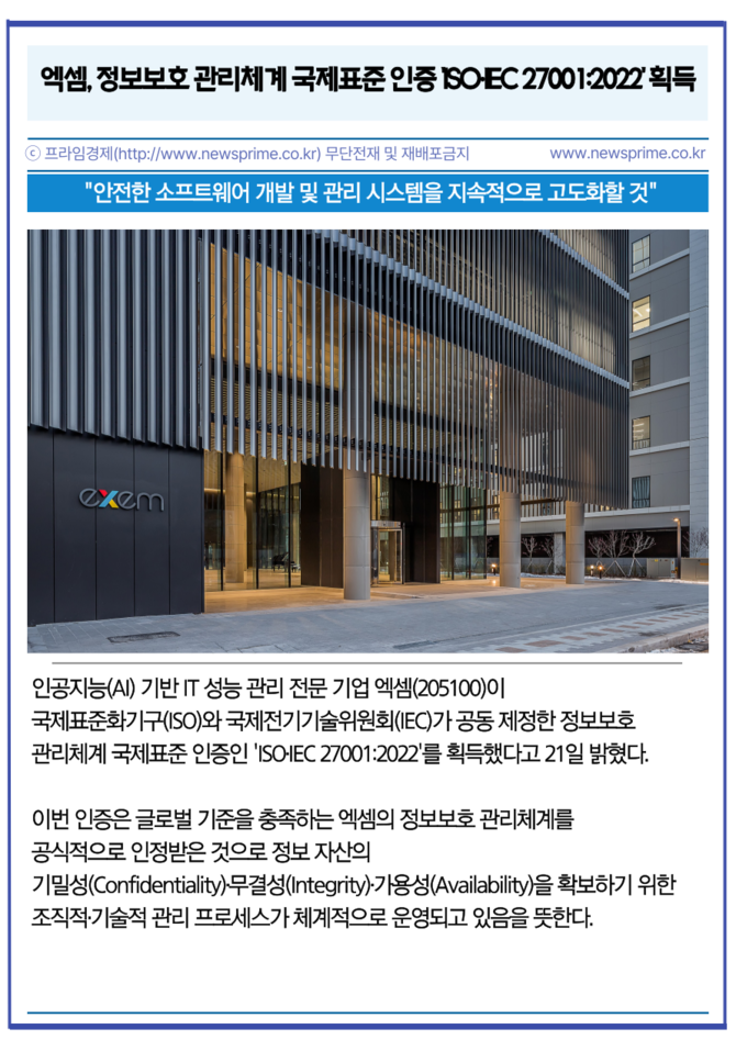 [프라임경제] 인공지능(AI) 기반 IT 성능 관리 전문 기업 엑셈(205100)이 국제표준화기구(ISO)와 국제전기기술위원회(IEC)가 공동 제정한 정보보호 관리체계 국제표준 인증인 'ISO·IEC 27001:2022'를 획득했다고 21일 밝혔다.