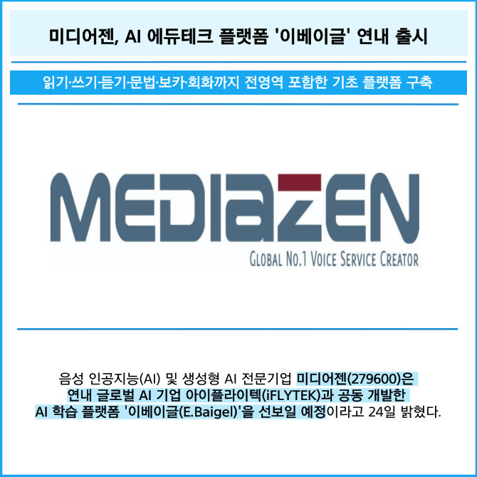 [프라임경제] 음성 인공지능(AI) 및 생성형 AI 전문기업 미디어젠(279600)은 연내 글로벌 AI 기업 아이플라이텍(iFLYTEK)과 공동 개발한 AI 학습 플랫폼 '이베이글(E.Baigel)'을 선보일 예정이라고 24일 밝혔다.