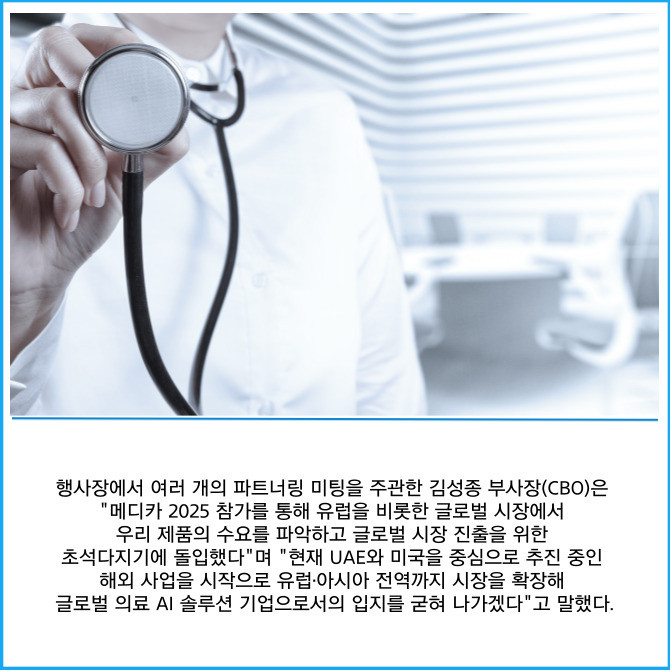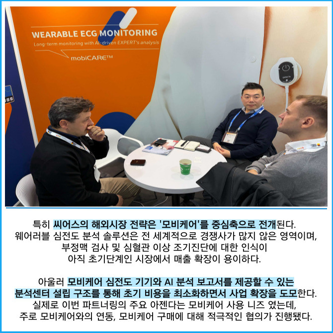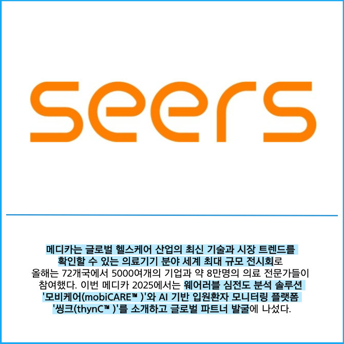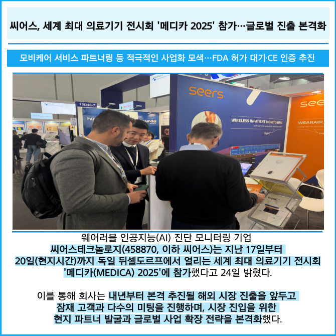 [프라임경제] 웨어러블 인공지능(AI) 진단 모니터링 기업 씨어스테크놀로지(458870, 이하 씨어스)는 지난 17일부터 20일(현지시간)까지 독일 뒤셀도르프에서 열리는 세계 최대 의료기기 전시회 '메디카(MEDICA) 2025'에 참가했다고 24일 밝혔다.
