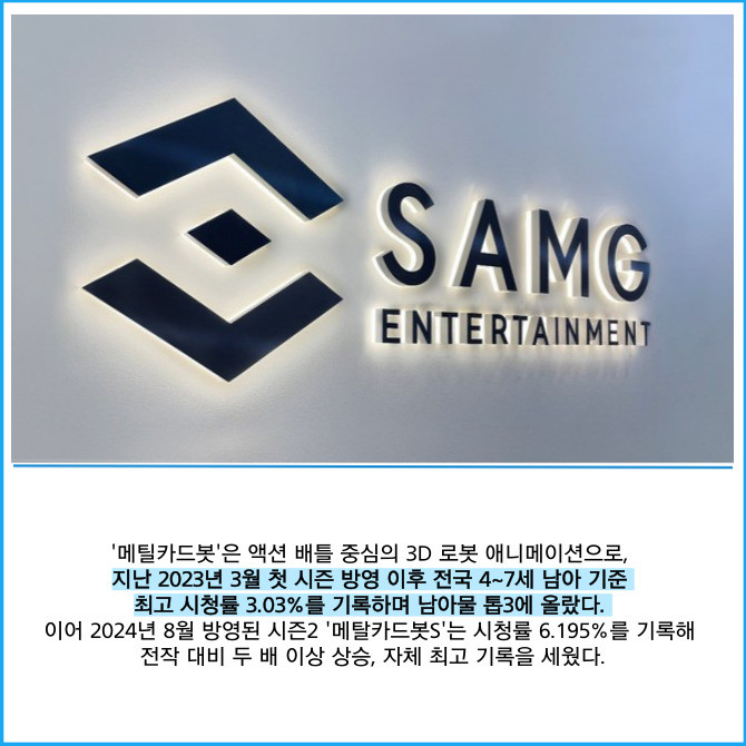 [프라임경제] 글로벌 지식재산권(IP) 콘텐츠 기업 에스에이엠지엔터테인먼트(419530, 이하 SAMG엔터)는 인기 애니메이션 시리즈 '메탈카드봇'의 새로운 시즌 '메탈카드봇W 강철의 포효’가 내달 4일부터 매주 목요일 오전 7시45분, EBS 1TV에서 정규 방영을 시작한다고 24일 밝혔다.