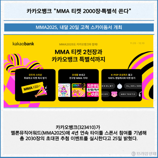 [프라임경제] 카카오뱅크(323410)가 멜론뮤직어워드(MMA2025)에 4년 연속 타이틀 스폰서 참여를 기념해 총 2030장의 초대권 추첨 이벤트를 실시한다고 25일 밝혔다.