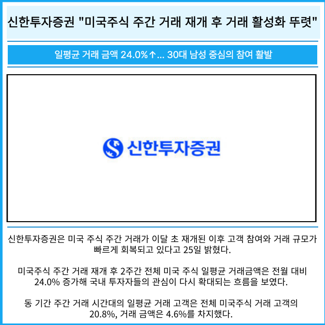 [프라임경제] 신한투자증권은 미국 주식 주간 거래가 이달 초 재개된 이후 고객 참여와 거래 규모가 빠르게 회복되고 있다고 25일 밝혔다.