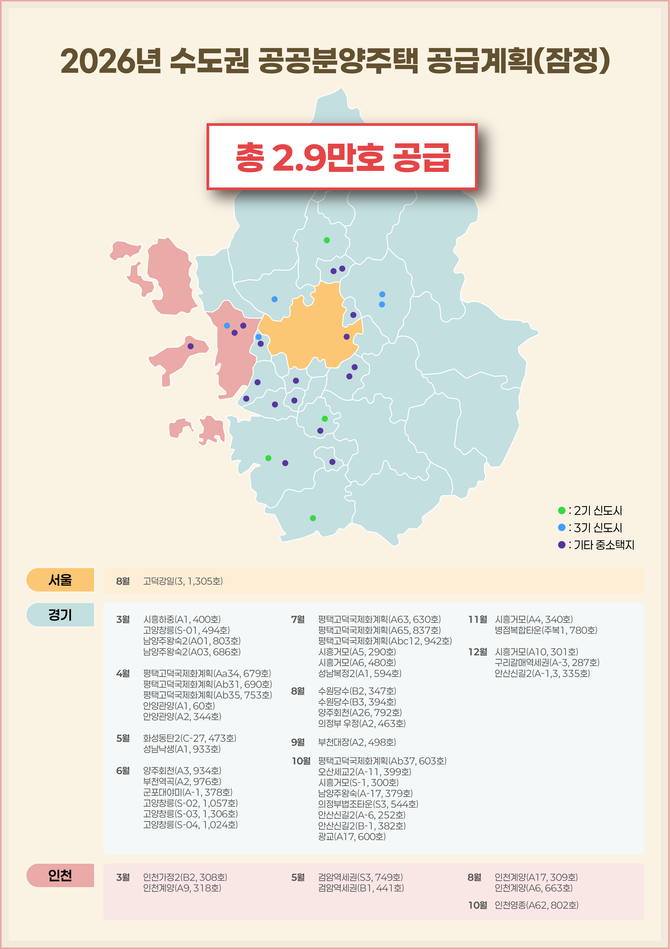 [프라임경제] 국토교통부(이하 국토부)가 오는 2026년 수도권 공공택지에 전체 2만9000호 규모 공공분양주택을 순차적으로 공급한다. 이번 물량은 새 정부 '주택공급 확대방안(9·7대책)'에서 제시된 2만7000호보다 약 2000호 증가한 규모다. 사실상 판교(2만9000호)급 신도시를 새롭게 조성하는 수준이다.